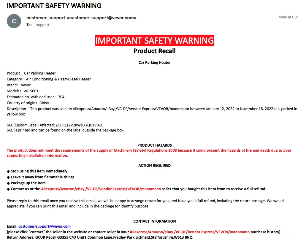 In essence anyone who has had or had fitted a Vevor diesel heater with the heater code 'WF 5001' are in breach of their vehicle insurance policy if the heater is not removed as per the recall detail. (This code was used on 2kw, 5kw and 8kw!). Heater code can be found on sticker located on side of heater.